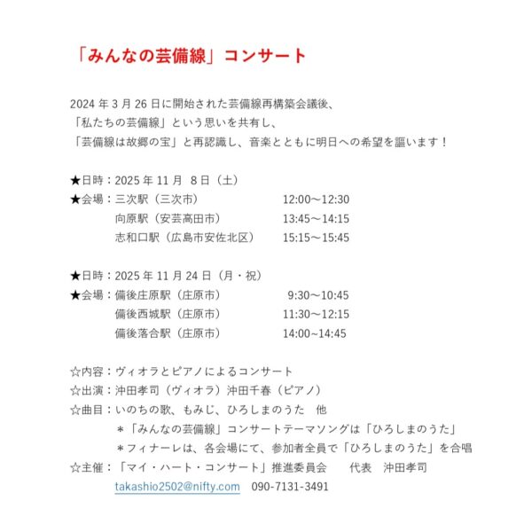 11月8日(土)24日(月・祝)は「みんなの芸備線」コンサート