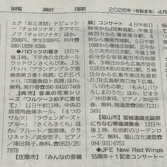 2026.04.03 MEDIA NEWS okitan日記 4月4日(土)・5日(日)は、4市7駅での「みんなの芸備線」コンサート 4月4日(土)・5日(日)の2日間にわたる「みんなの芸備線」コンサートのことが、 中国新聞「情報交差点」に掲載されていました。 なにしろ、 4市7駅でのコンサートです。 始発の東城駅→備後落合駅→備後西城駅→備後庄原駅→三次駅→向原駅→志和口駅、 そして、 広島駅南口地下広場が終点となります。 芸備線を利用して各駅を回れればと、 時刻表を手に試行錯誤しましたが、残念ながら不可能でした。 ご近所の皆様、お時間許せば是非!