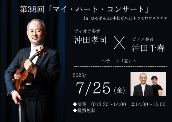 第38回「マイ・ハート・コンサート」in ひろぎんHD本社ビル1Fトゥモロウスクエア ~ テーマ 「夏」 ~ イベント詳細 日付: 2025年7月25日 1:30 PM – 3:00 PM カテゴリ: ひろぎんマイ・ハート 第38回「マイ・ハート・コンサート」in ひろぎんHD本社ビル1Fトゥモロウスクエア ~ テーマ 「夏」 ~ ★日時:7月25日(金)①13:30~14:00、②14:30~15:00 ★会場:ひろぎんHD本社ビル1Fトゥモロウスクエア ★出演:沖田孝司ヴィオラ)沖田千春(ピアノ) ★鑑賞無料 ★問合せ:(株)たびまちゲート広島 地域商社事業部 082-554-5805(平日9:30~17:30)